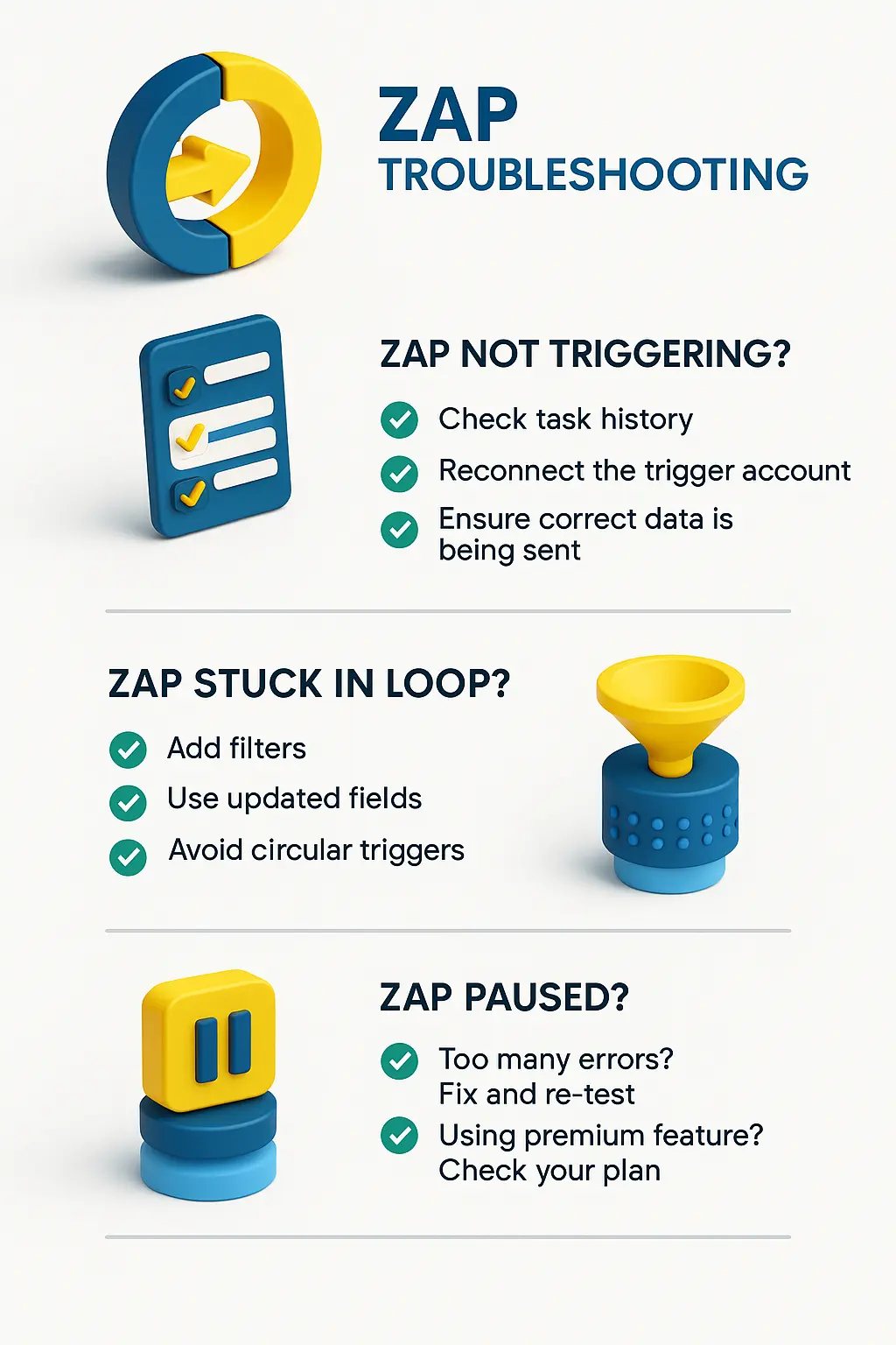 Zap not triggering → Check task history- Zap stuck in loop → Add filters- Zap paused → Fix errors or upgrade plan