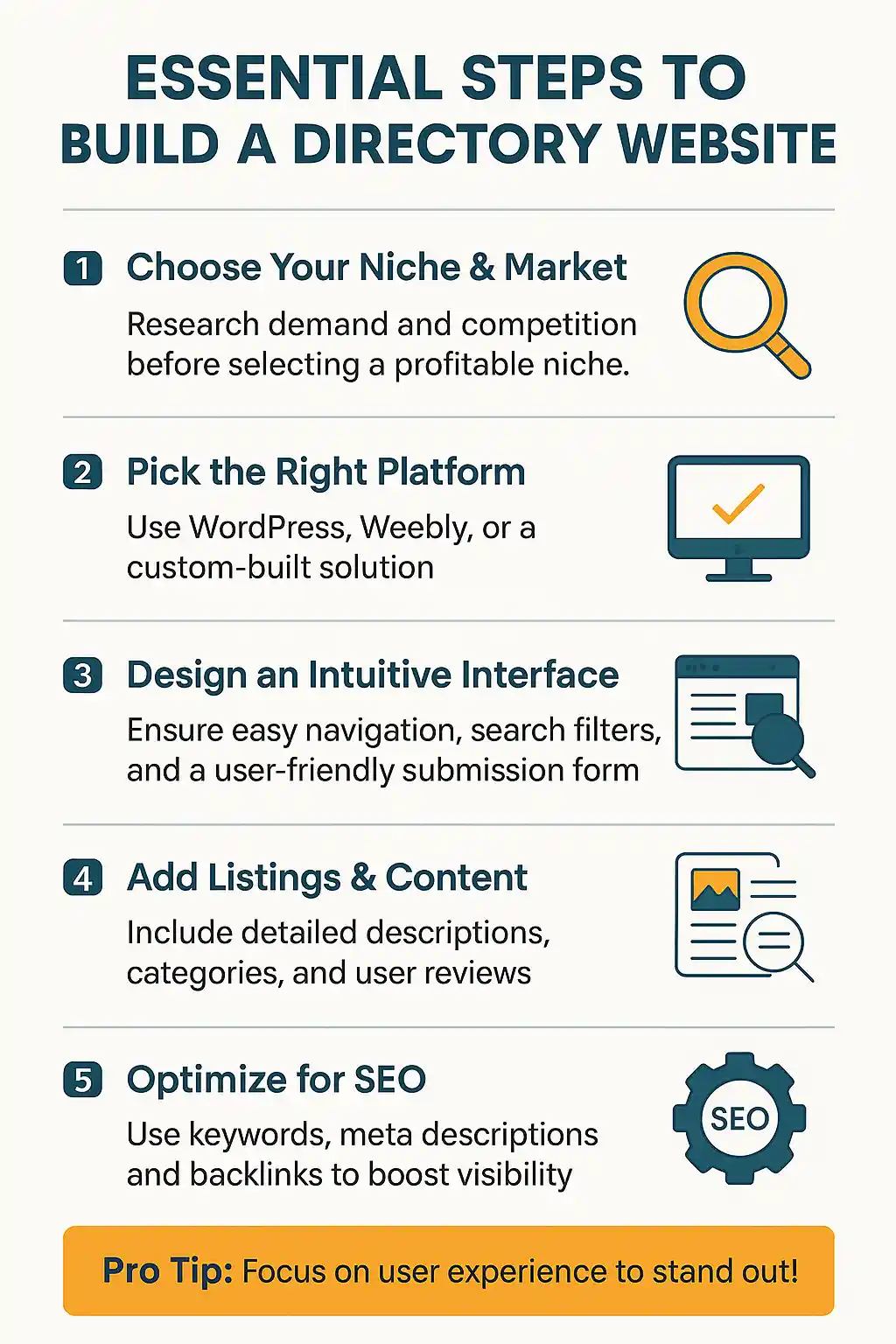 1. Choose a niche and research market demand. 2. Select a platform (WordPress, Weebly, or custom-built). 3. Design a user-friendly interface. 4. Add categorized listings with detailed content. 5. Optimize for SEO to increase traffic.