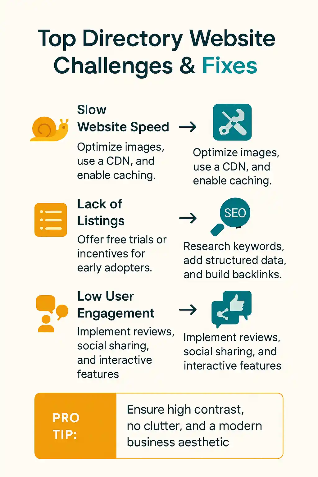 Slow Website Speed → Optimize images & use CDN. Lack of Listings → Offer free trials or incentives. Poor SEO → Use structured data, keyword optimization.