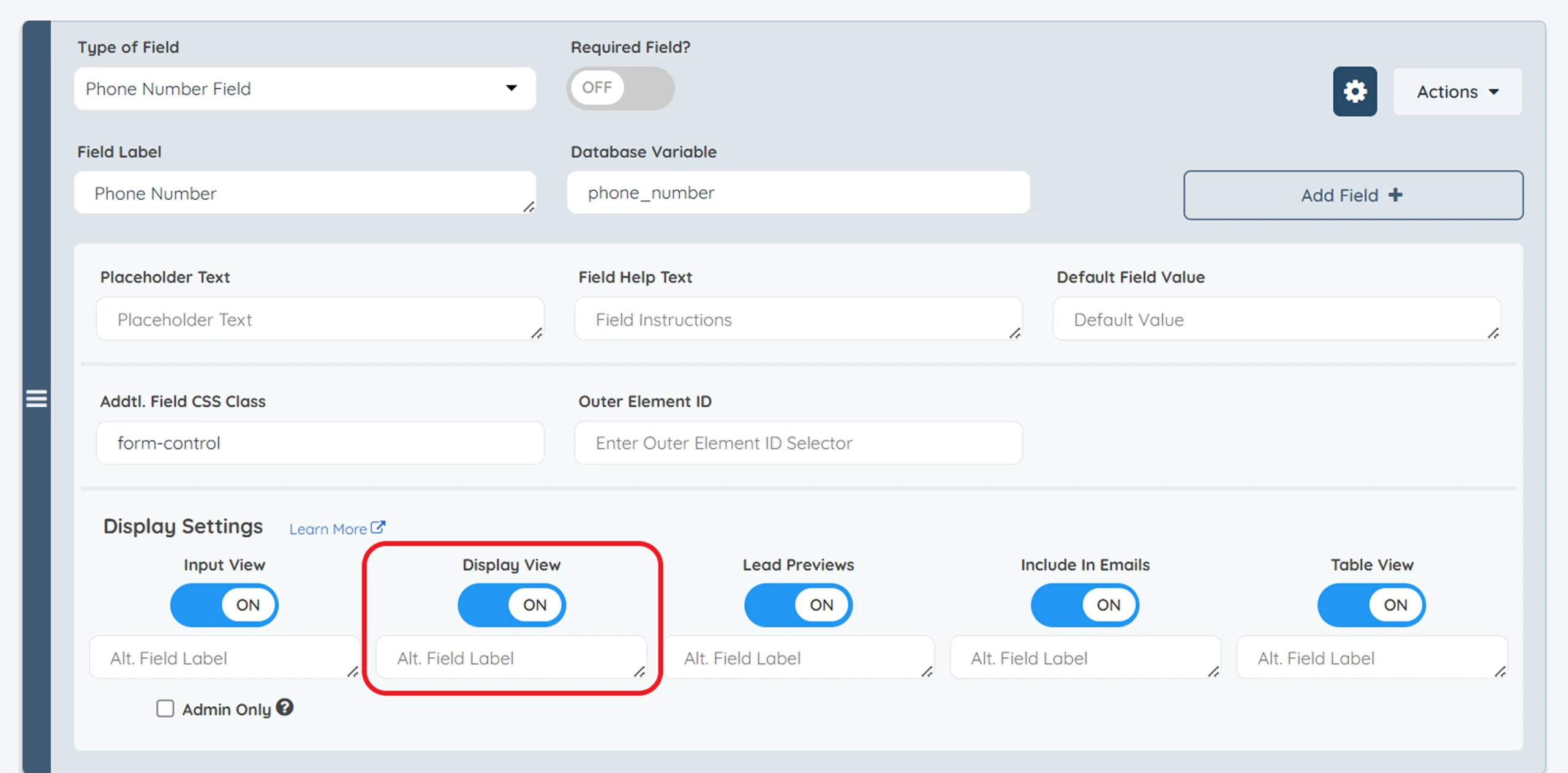 Before moving on, double-check that Display View is enabled for this new field under the Display Settings section. This ensures the field becomes visible on the front end.