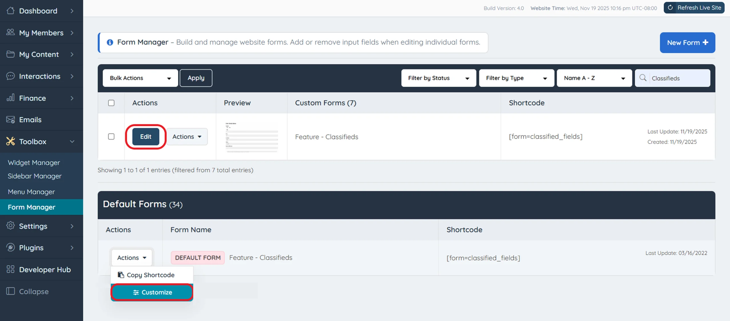 To begin, you’ll need to modify an existing feature form. Head over to Toolbox » Form Manager, then click Customize on the form you want to edit. If the form has already been customized, select Edit instead.