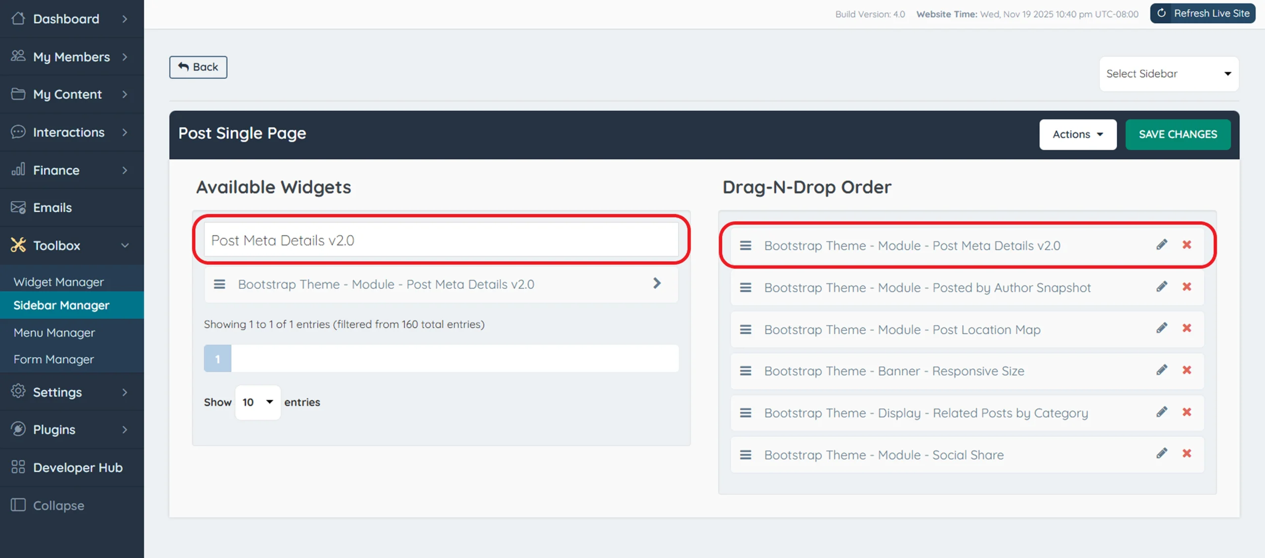 Inside the editor, locate the widget named Bootstrap Theme – Module – Post Meta Details v2.0 and drag it into the Drag-N-Drop Order area.