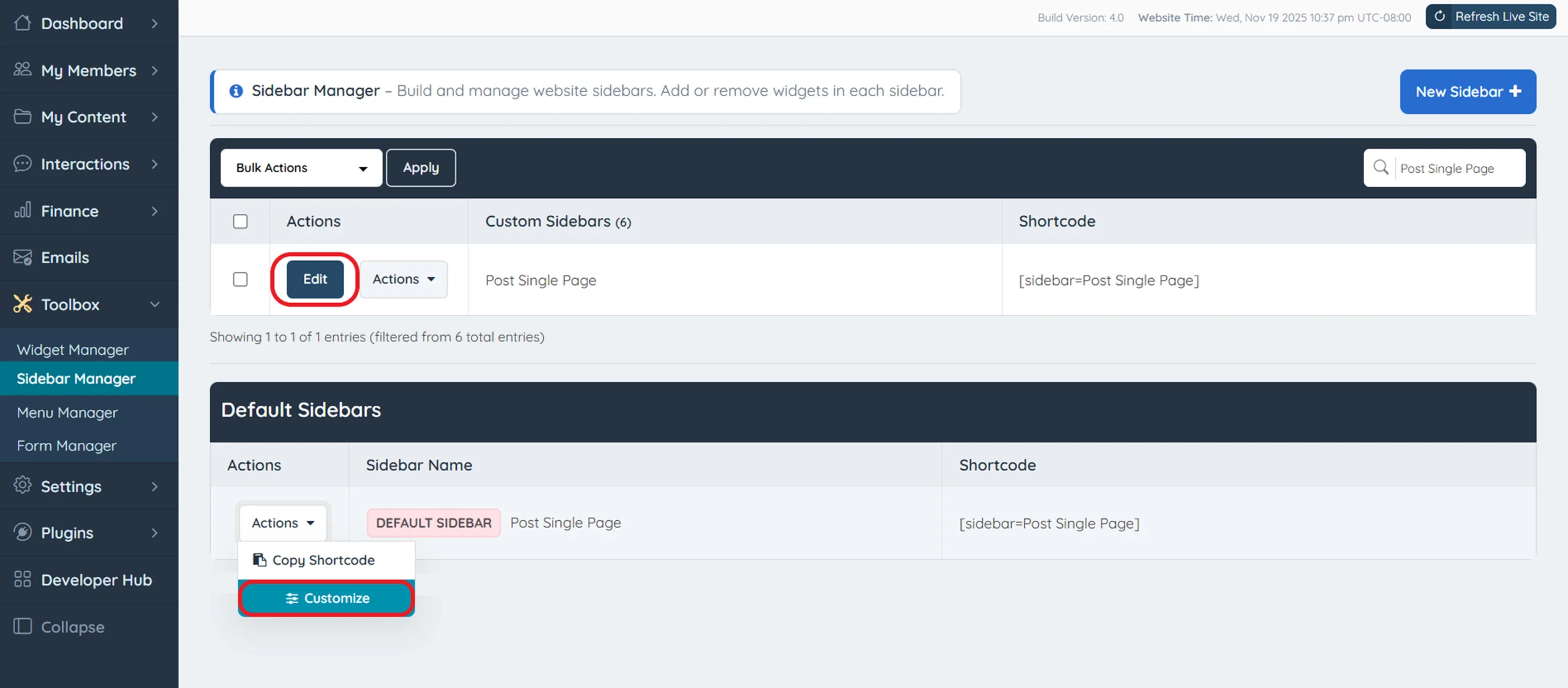 Next, go to Toolbox » Sidebar Manager and select Customize for the Post Single Page sidebar. If it’s a custom sidebar, click Edit instead.