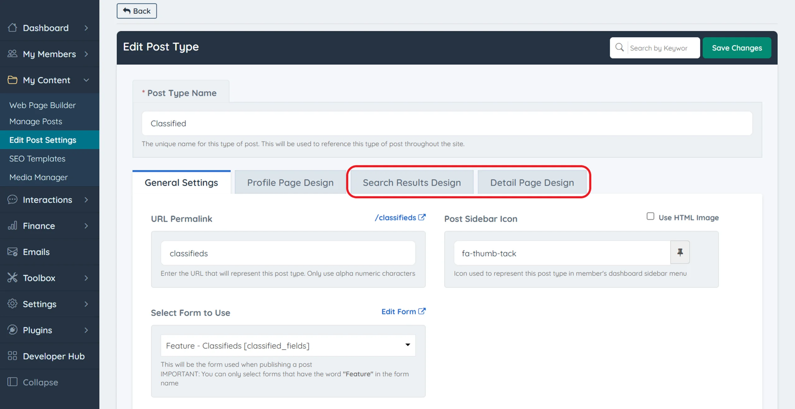 Inside the settings, you’ll find two important tabs: Search Results Design and Detail Page Design. These are the sections you’ll be using: