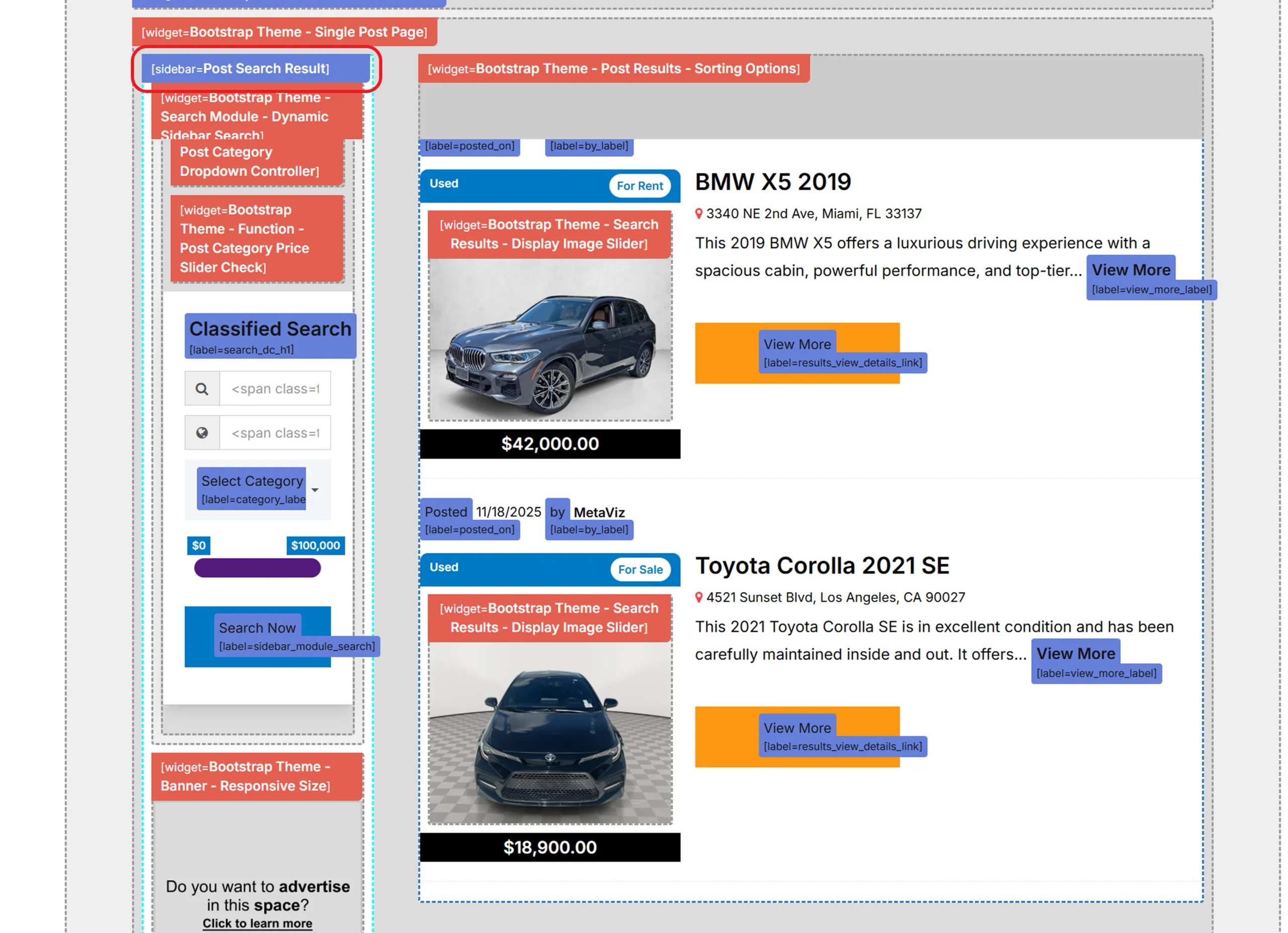 Each Post Type has its own search results and details pages, both powered by assigned sidebars. These sidebars control what filters, widgets, and tools appear on each page.