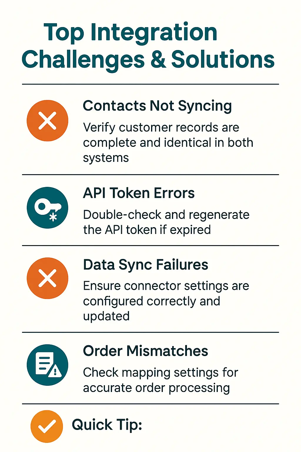 – Contacts not syncing: Ensure complete and matching customer records – API token errors: Verify and regenerate if needed – Data sync failures: Check connector settings